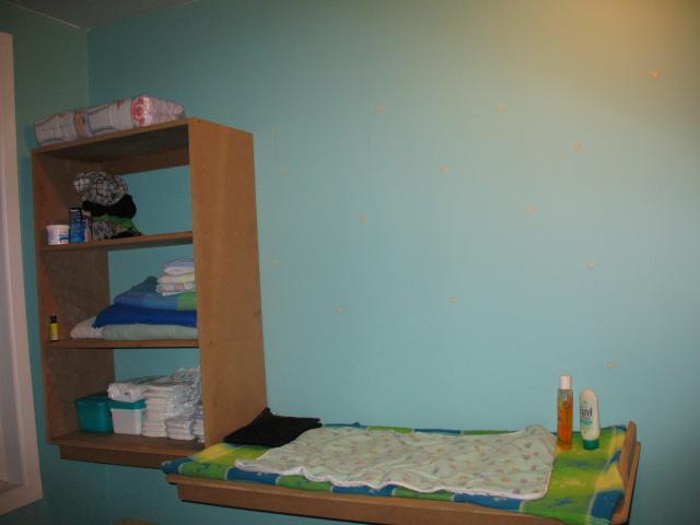 Mon chum m'as fait une super table à langer cette semaine! Elle est accrocher au mur (donc aucune perte d'espace) et le meuble de rangement est a la même hauteur que la table... donc pas besoin de ce pencher et on ne quitte pas le poupon des yeux!! Sa va vraiment bien... Si jamais sa vous intéresse faite moi signe...!