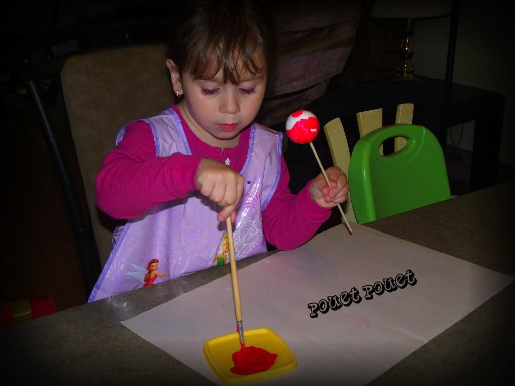 Les moins habiles auront peut-être un peu de difficulté à peindre la partie de la pomme qui se trouve tout près de la brochette, vous pouvez leur faciliter la tâche en leur tenant le bâton pendant qu'ils peindront cette partie.